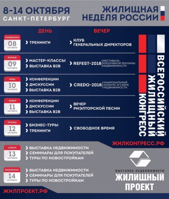 Жилищная неделя стартует в понедельник, 8 октября. В этот день начнет свою работу Санкт- Петербургский Всероссийский жилищный конгресс – крупнейшее мероприятие рынка недвижимости формата B2B в России. Конгресс соберет рекордное число участников - около 3 тысяч профессионалов из России и 25 зарубежных стран. В рамках Конгресса будет проведено около 400 мероприятий, которые охватят буквально все аспекты рынка недвижимости. Прозвучит свыше 500 докладов. Состоятся более 60 мастер-классов и тренингов от ведущих бизнес-тренеров и практиков рынка недвижимости. Среди них – Игорь Манн, Игорь Рызов и многие другие известные имена. Пройдут бизнес-туры от крупнейших строительных компаний Санкт-Петербурга и Ленобласти. Участников Конгресса ждет масштабная культурно-развлекательная программа. В частности, состоится Международный фестиваль креативной рекламы недвижимости REFEST, церемония награждения победителей Национального конкурса в сфере недвижимости CREDO и Вечер риэлторской песни. В рамках Санкт-Петербургского Всероссийского жилищного конгресса впервые пройдет фотовыставка «История рынка недвижимости российского».